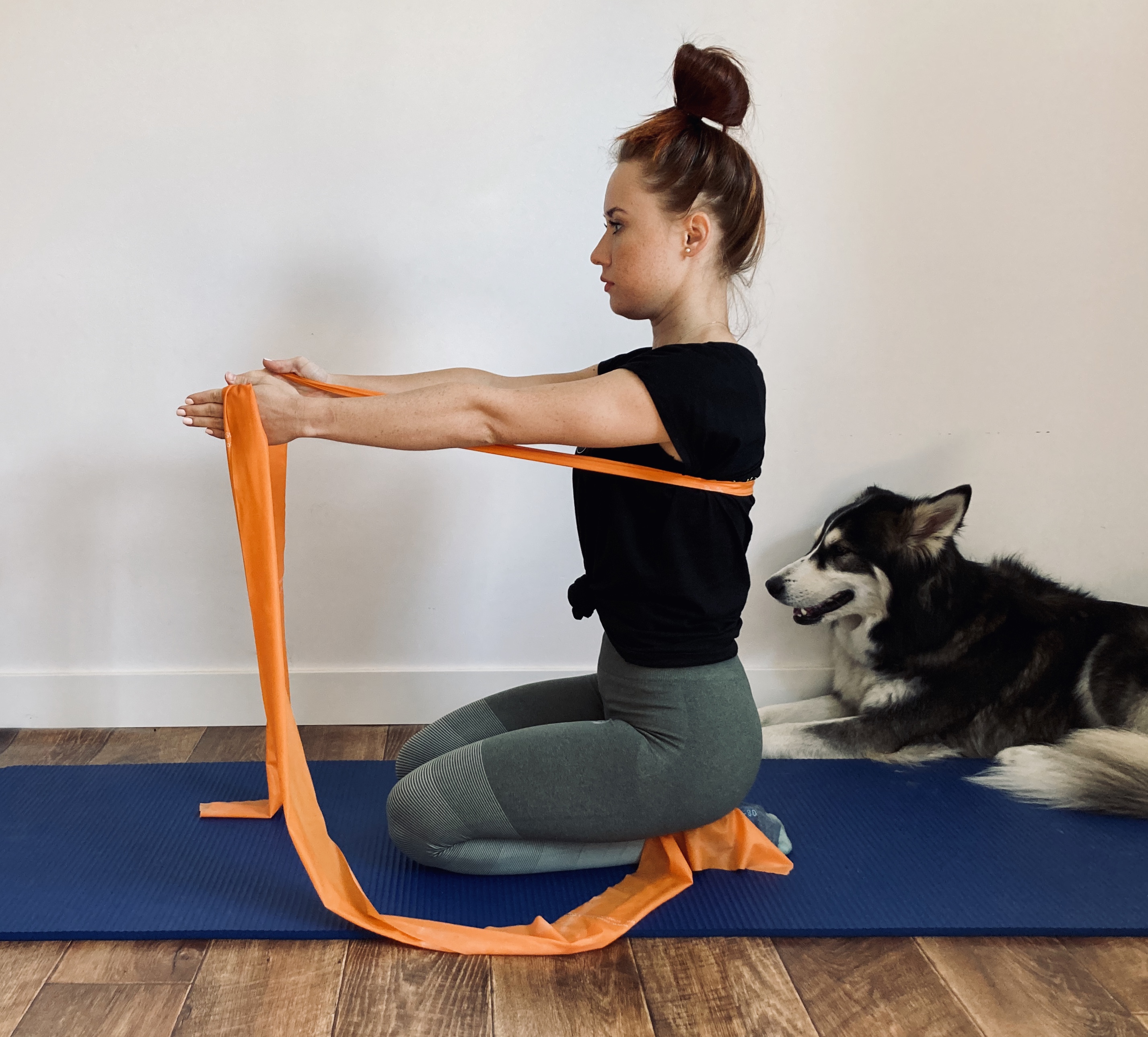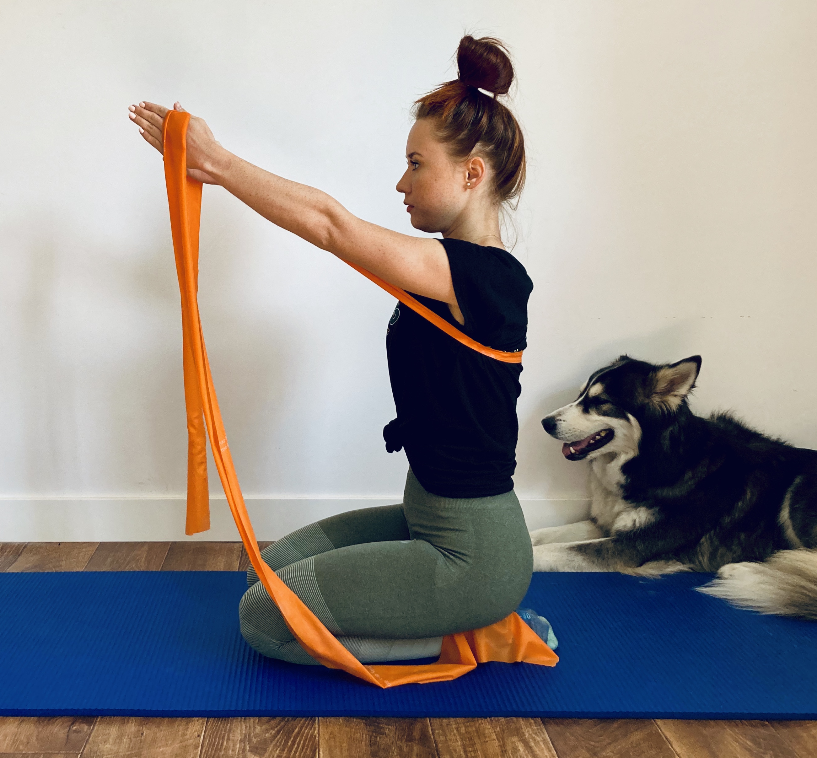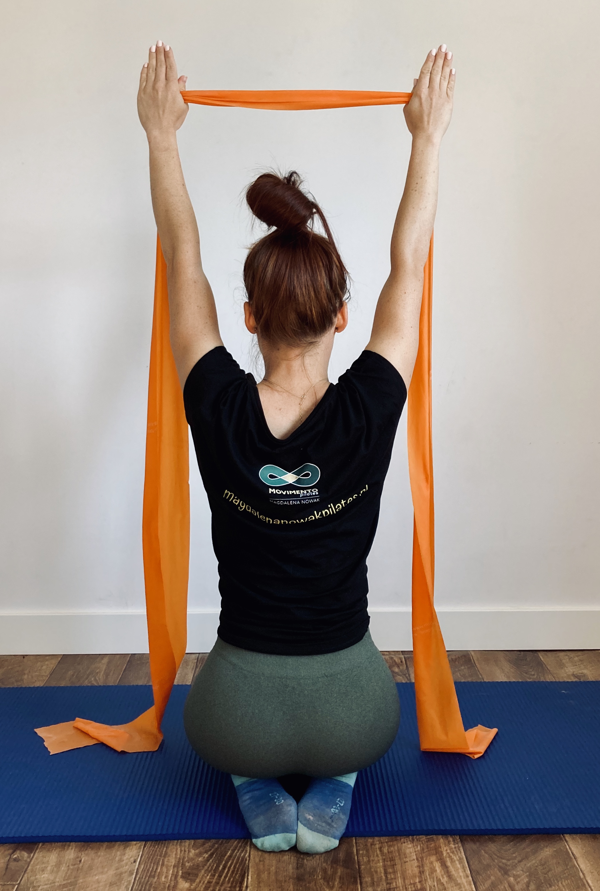 Jak wykonać ćwiczenie: Przybierz pozycję siadu klęcznego. Złap taśmę na szerokość swoich ramion. Podnieś ręce do góry z wdechem tak aby palce patrzyły w sufit. Napnij brzuch, z wydechem opuść ręce na boki do lini prostej rozciągając taśmę . Ćwiczenie powtórz 15 razy.