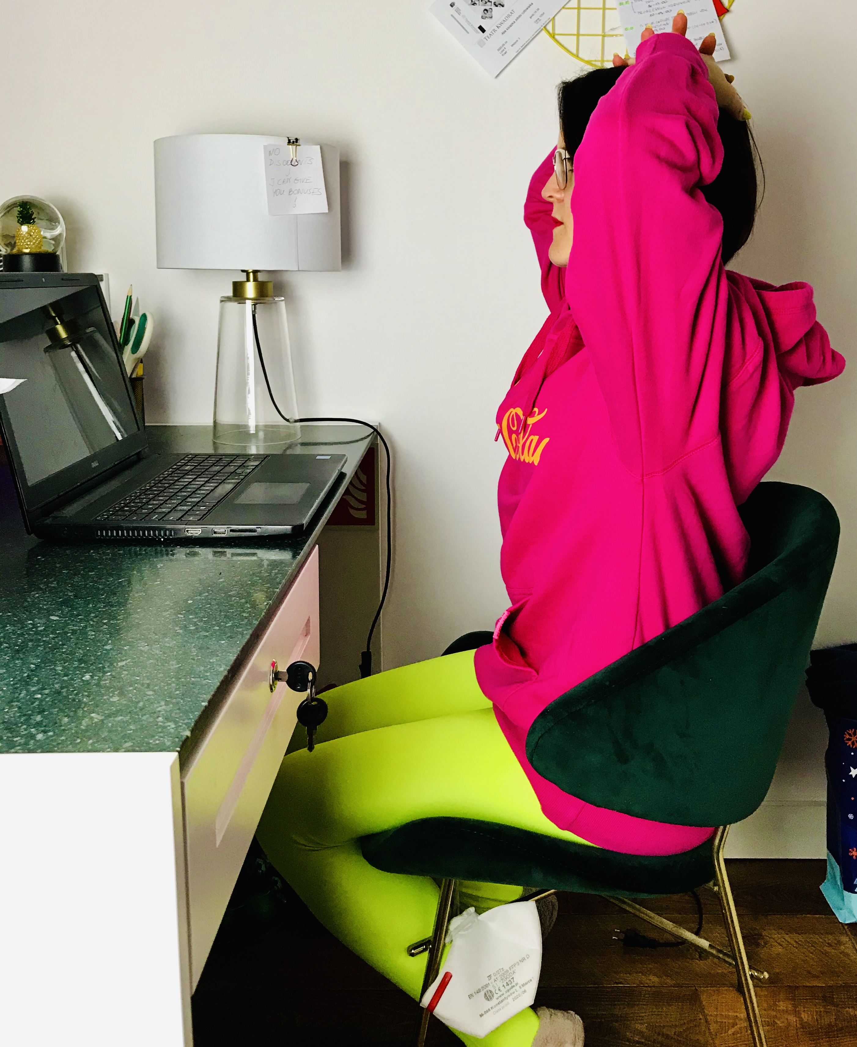 Pozycja: Siedzenie przy biurku (nogi na szerokość bioder, miednica neutralna, guzy kulszowe równomiernie posadzone na siedzisku, neutralne krzywizny kręgosłupa, wydłużone plecy, aktywny brzuch). Wzrok skierowany przed siebie, splecione dłonie oparte o potylicę. Łokcie skierowane lekko w przód, by łopatki leżały wygodnie na plecach ( nie ściągnięte), a barki oddalone od uszu.