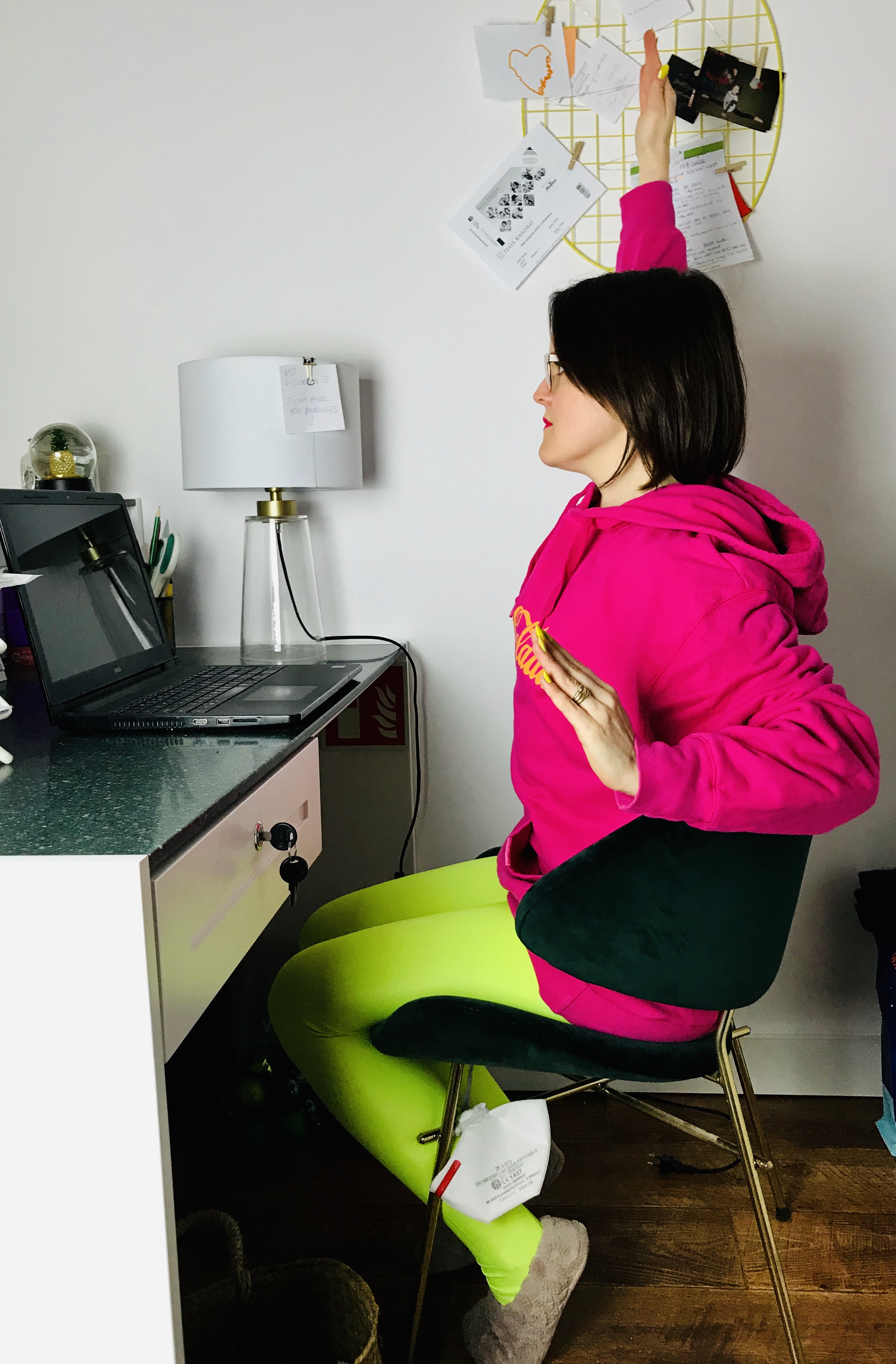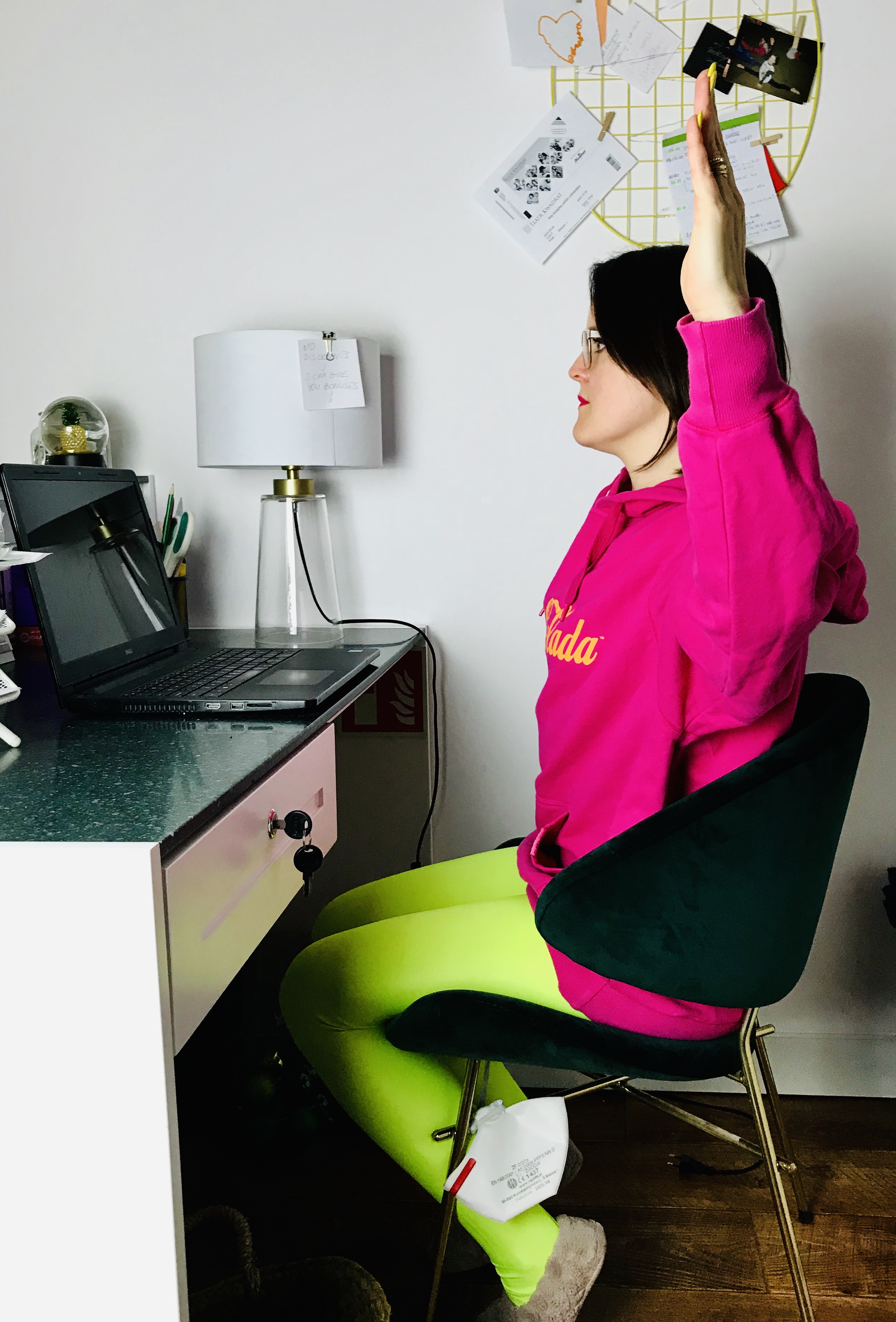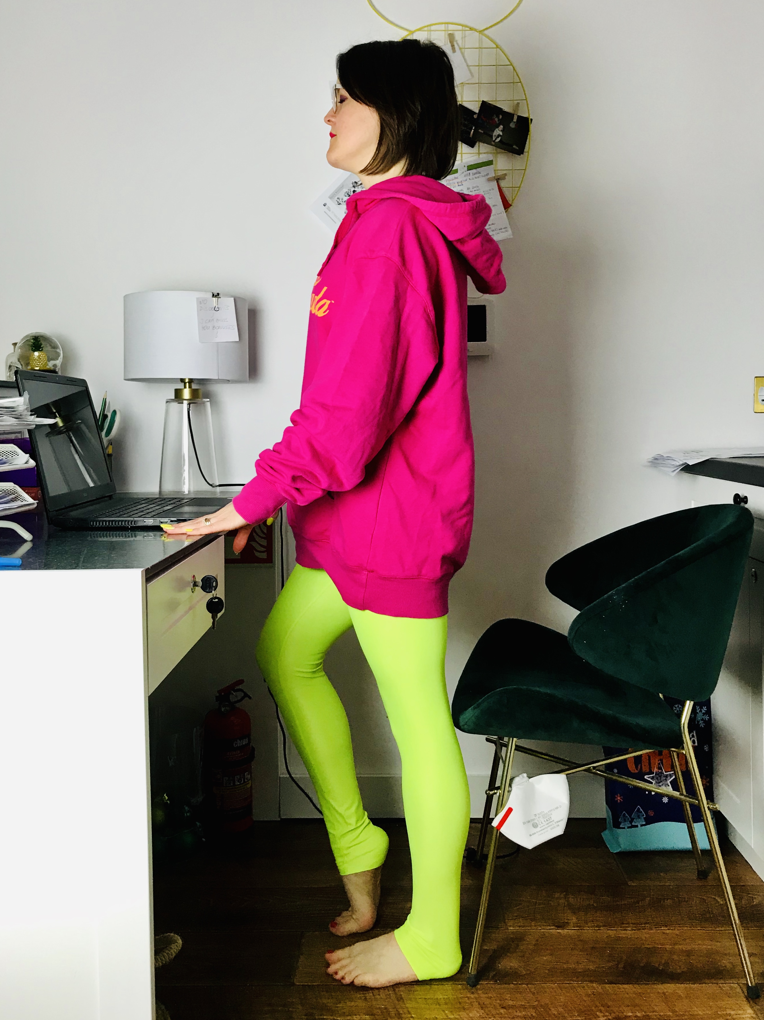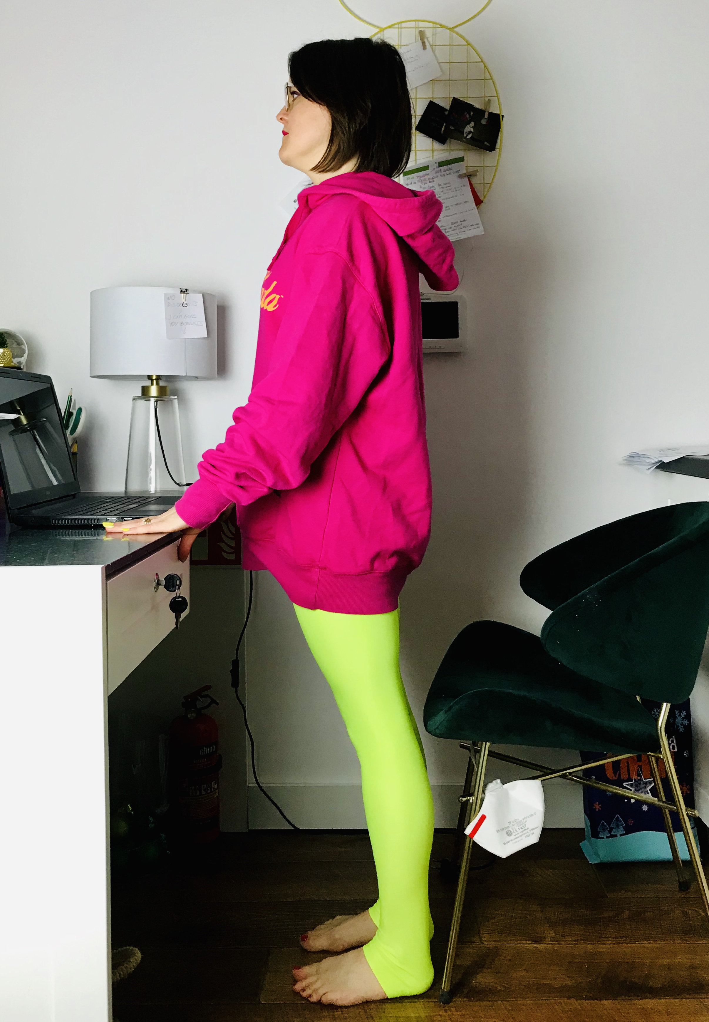 Pozycja: Stanie przy biurku, dłonie najlepiej oparte lekko o blat. Nogi ustawione na szerokość bioder, z ciężarem ciała równomiernie na nich rozstawionym (bez przeciążania wewnętrznej lub zewnętrznej krawędzi stóp). Pośladki i brzuch zaangażowane, by w jak najlepszej pozycji utrzymać miednic. Żebra zasznurowane, kręgosłup wydłużony. Wzrok skierowany przed siebie.