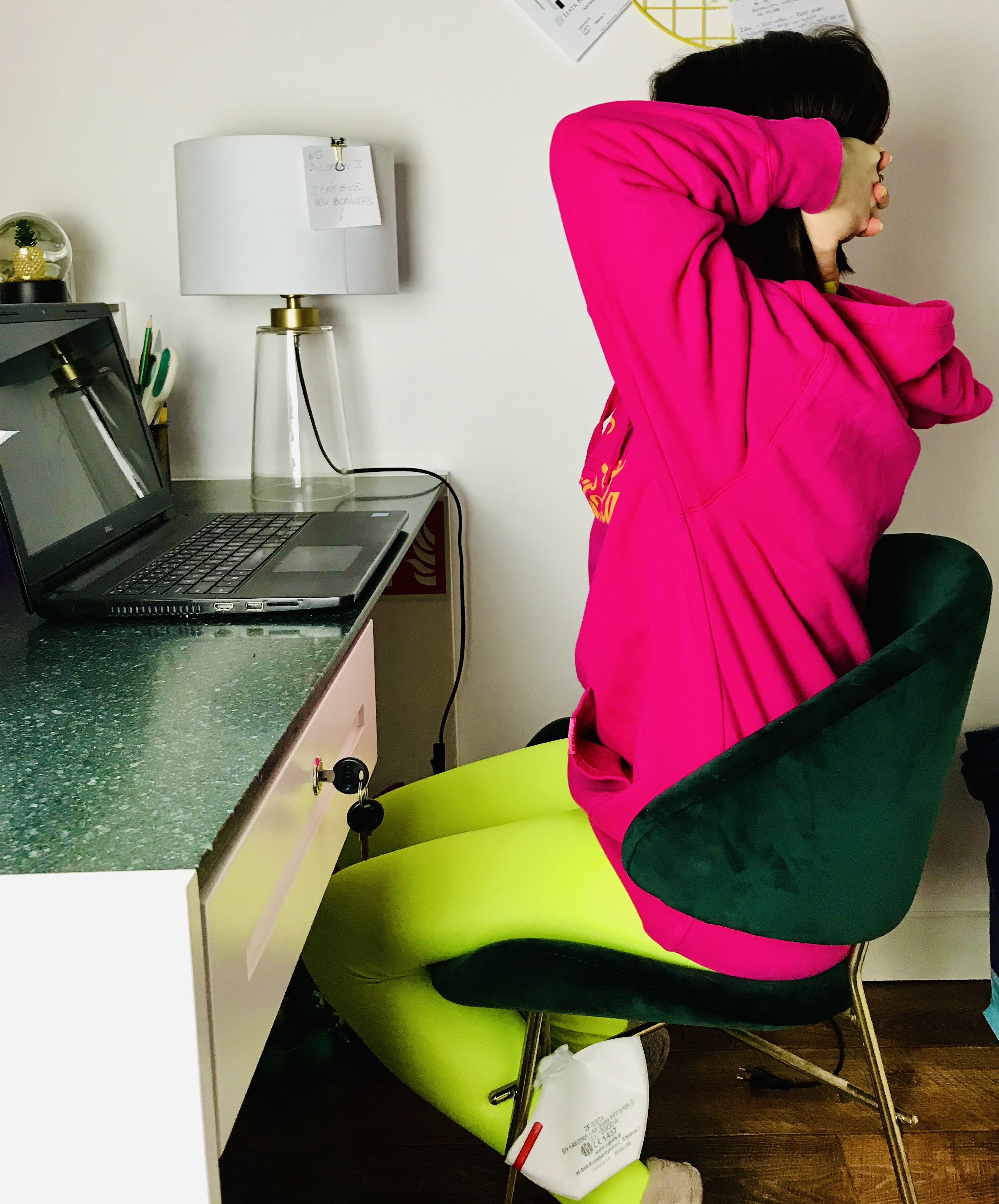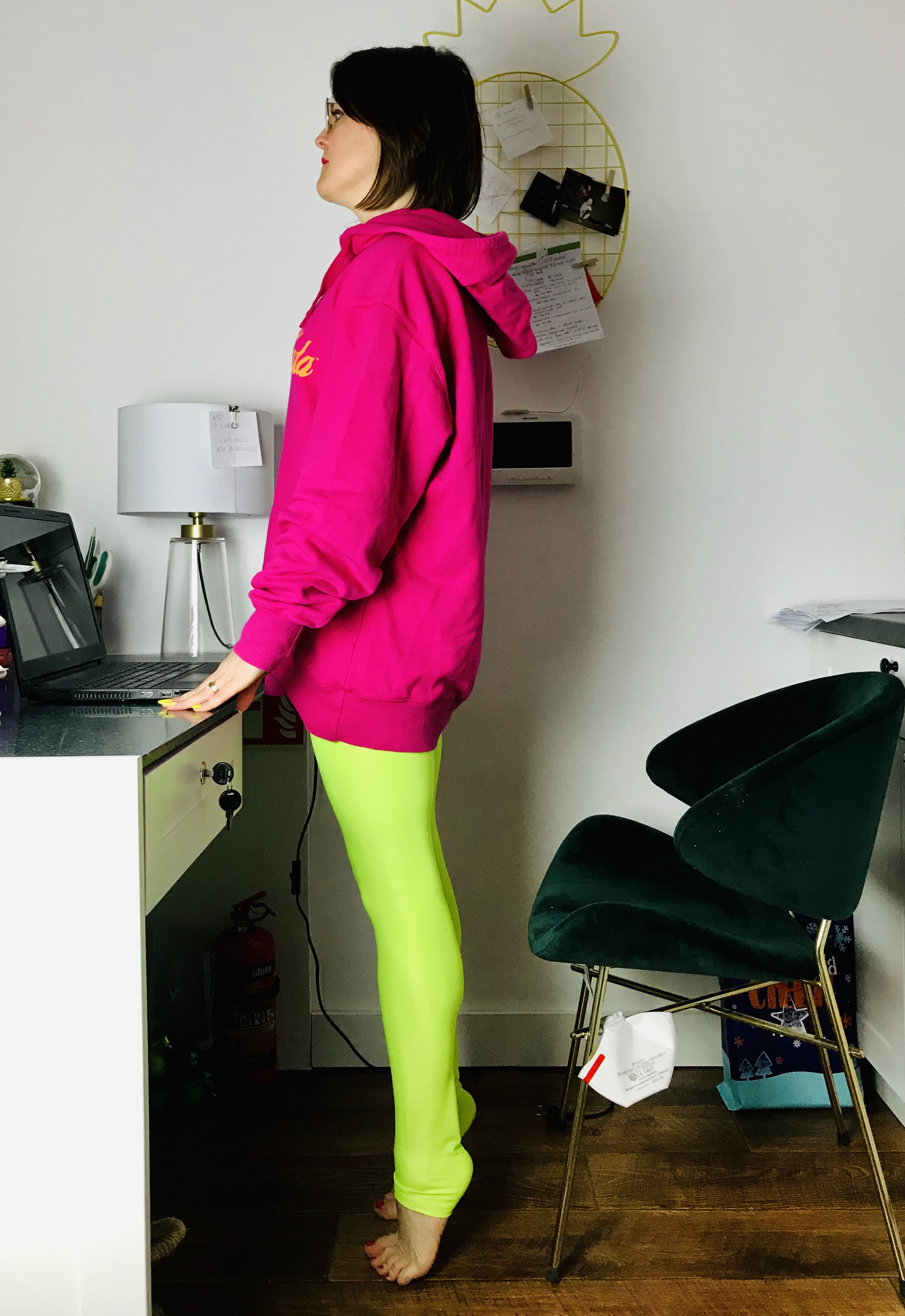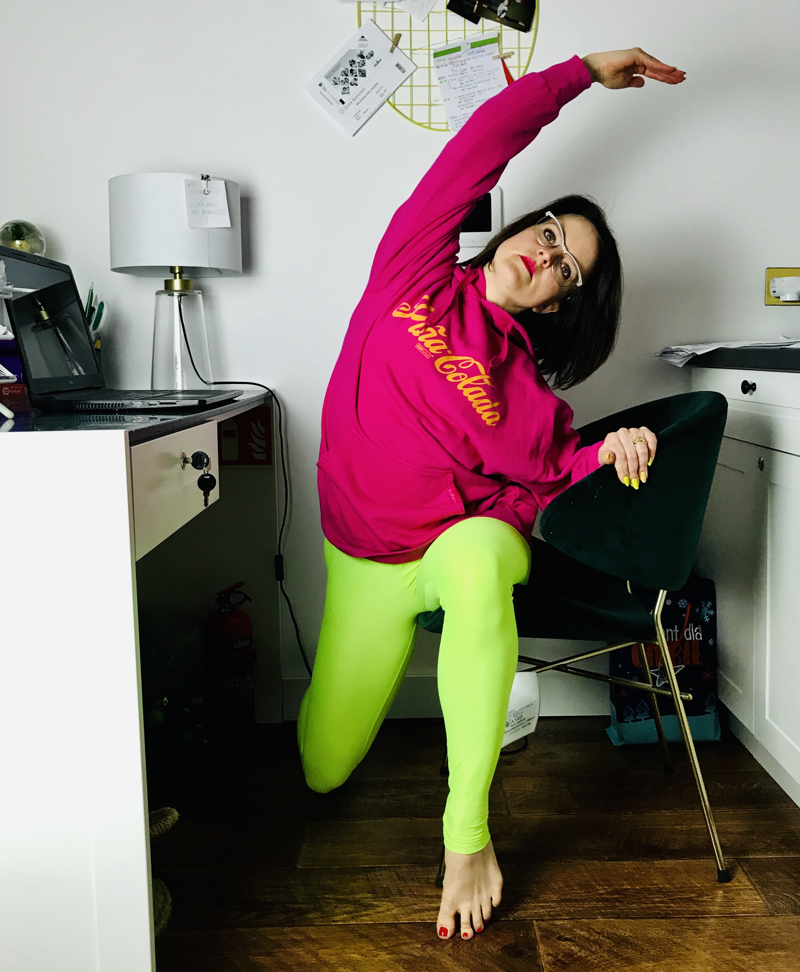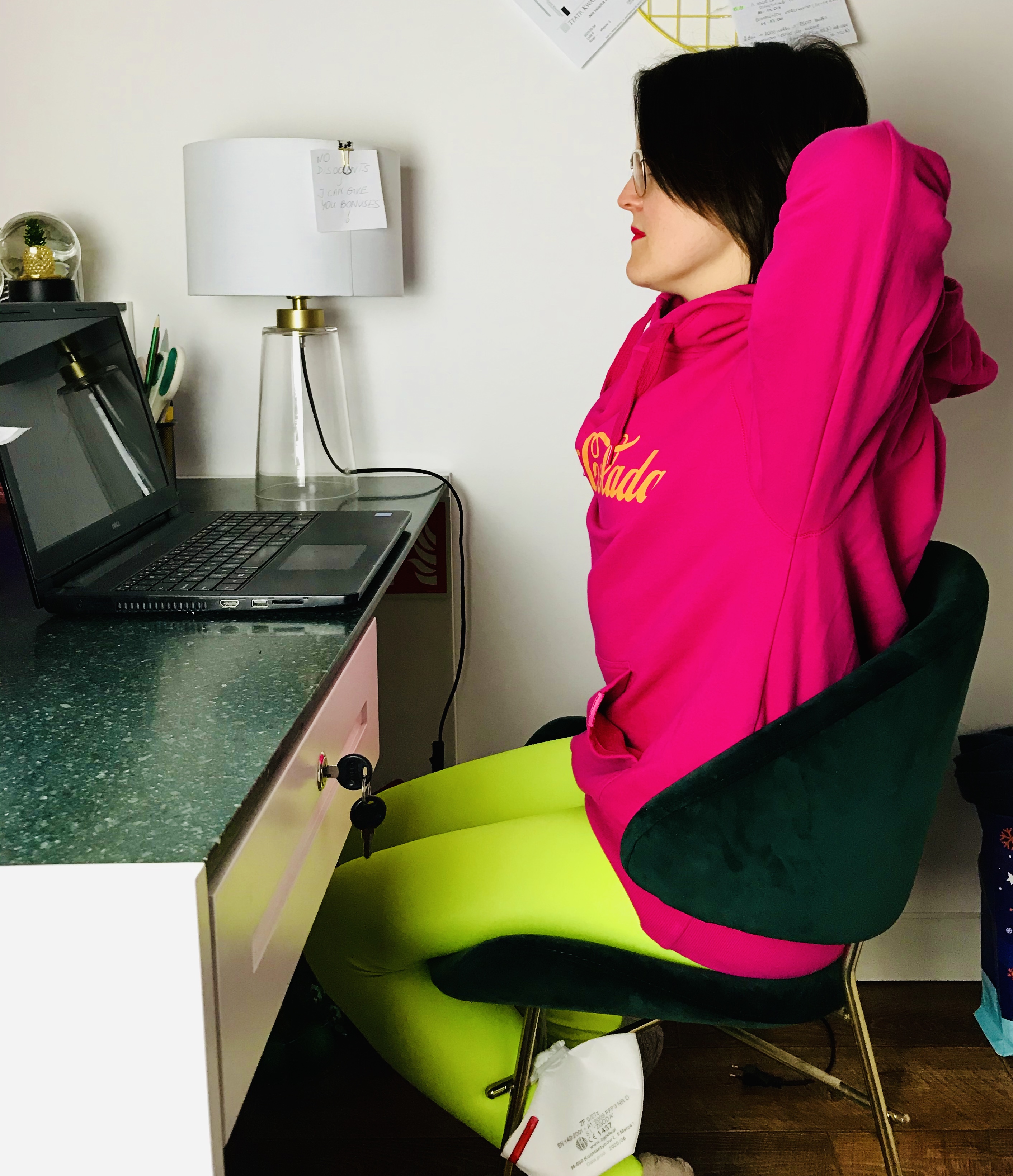 Pozycja: Stanie przy biurku, dłonie najlepiej oparte lekko o blat. Nogi ustawione na szerokość bioder, z ciężarem ciała równomiernie na nich rozstawionym (bez przeciążania wewnętrznej lub zewnętrznej krawędzi stóp). Pośladki i brzuch zaangażowane, by w jak najlepszej pozycji utrzymać miednic. Żebra zasznurowane, kręgosłup wydłużony. Wzrok skierowany przed siebie.