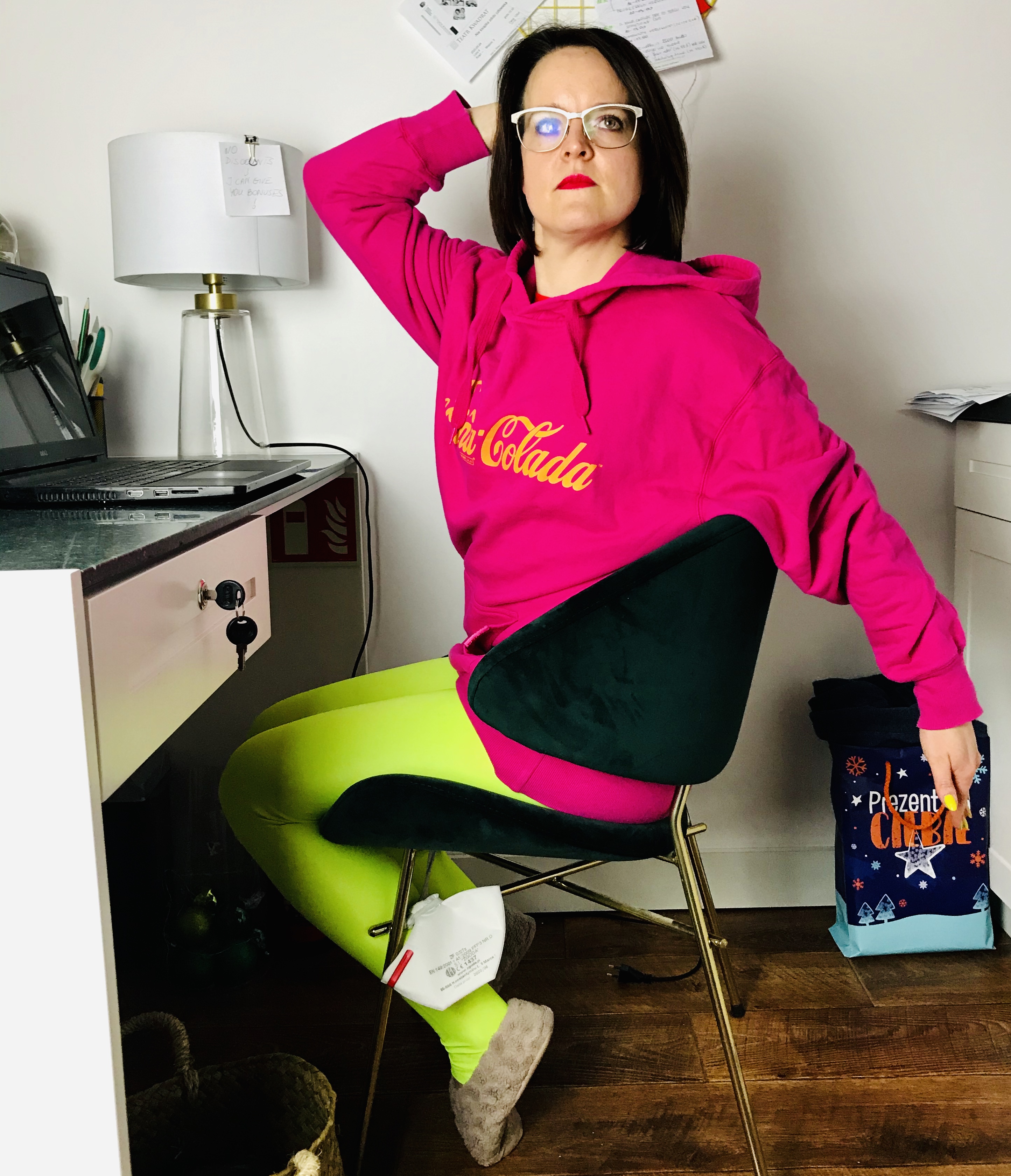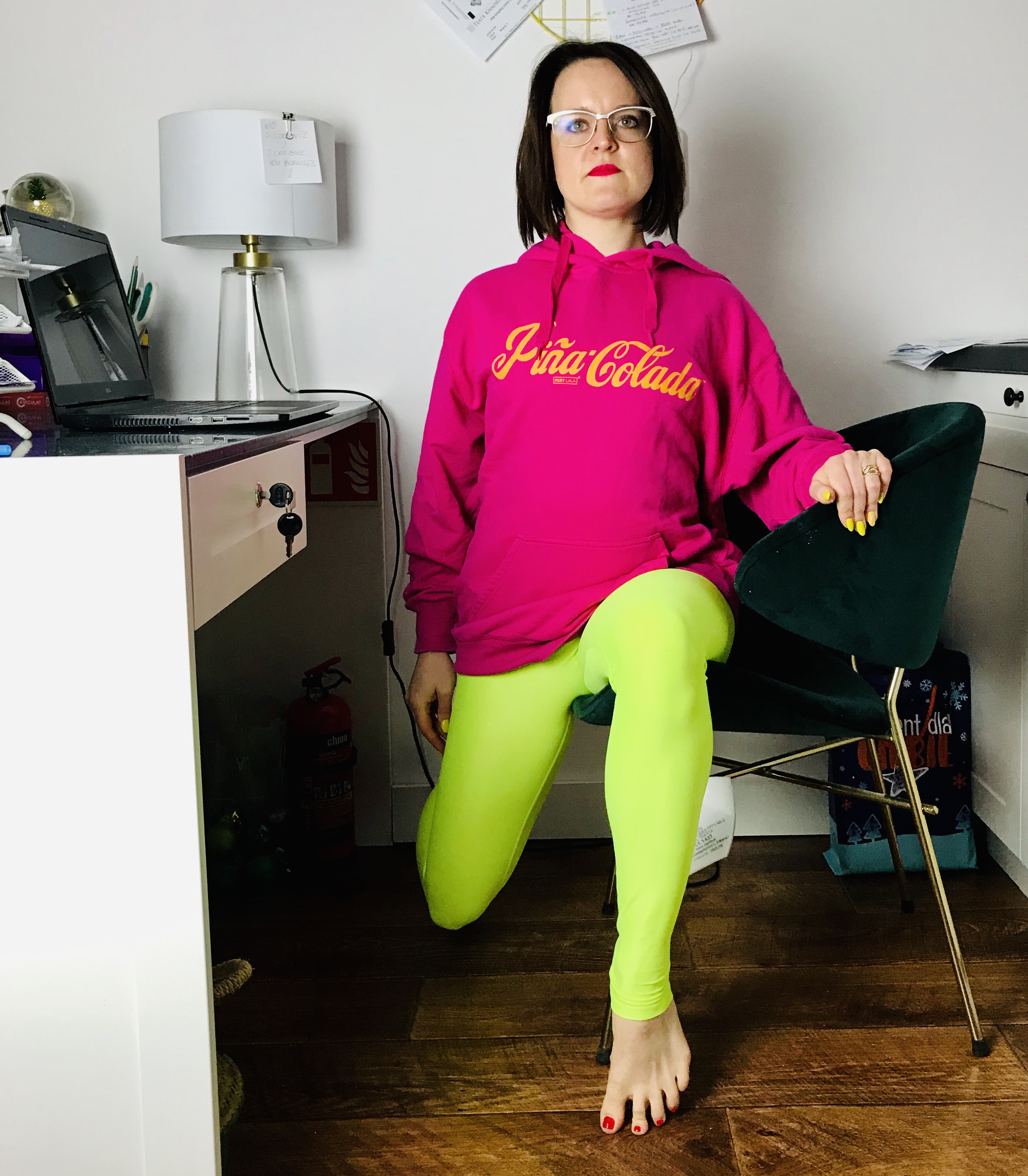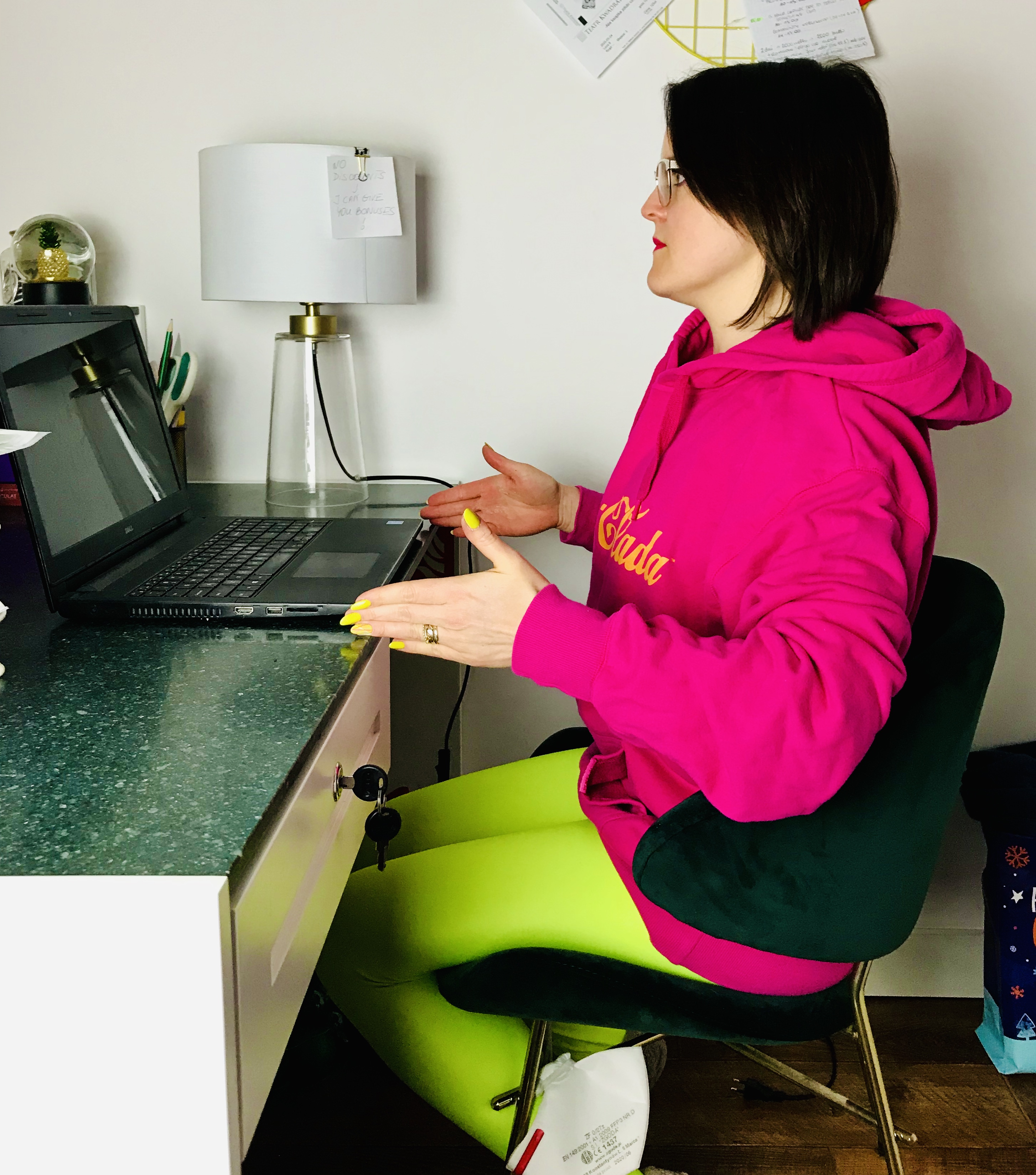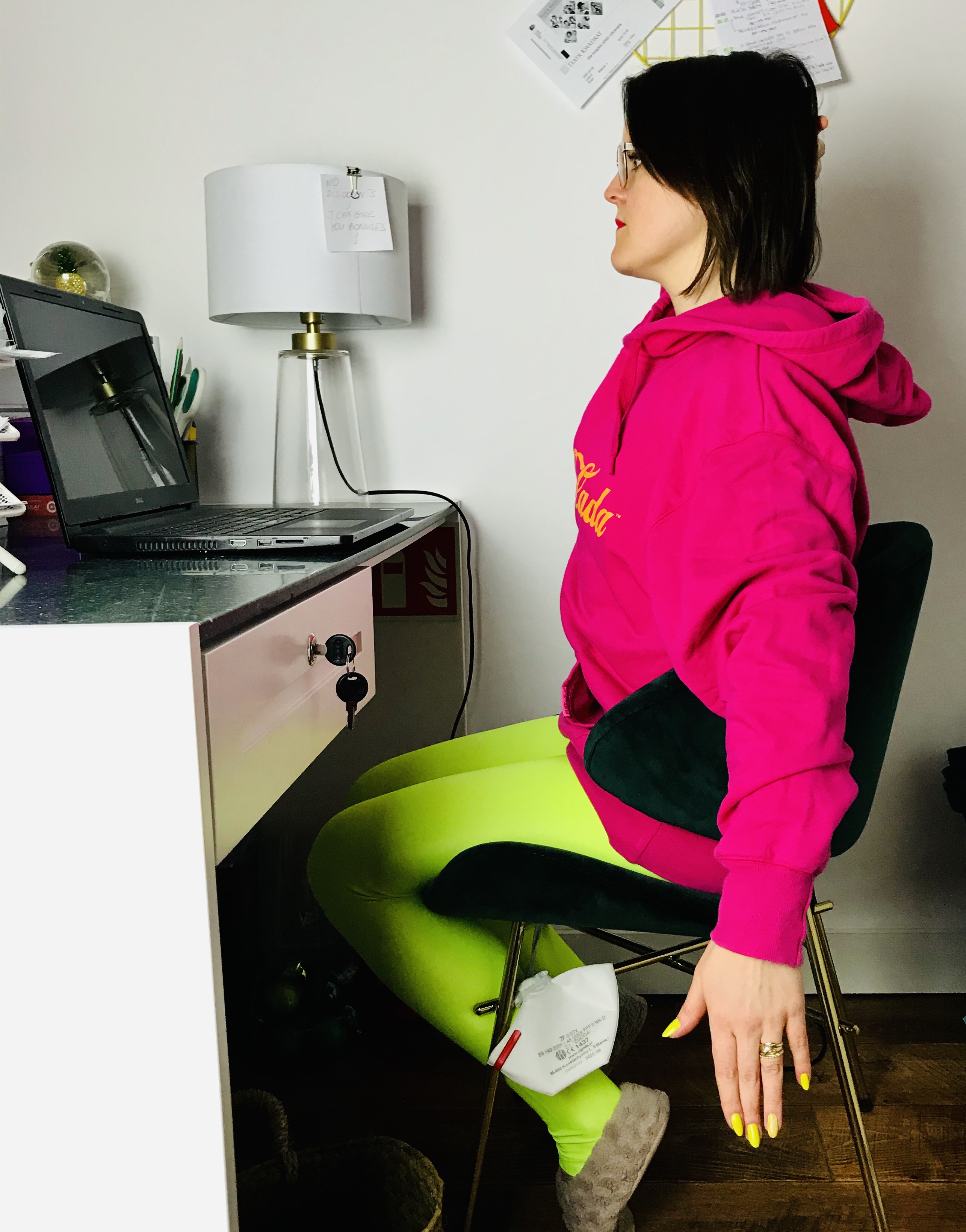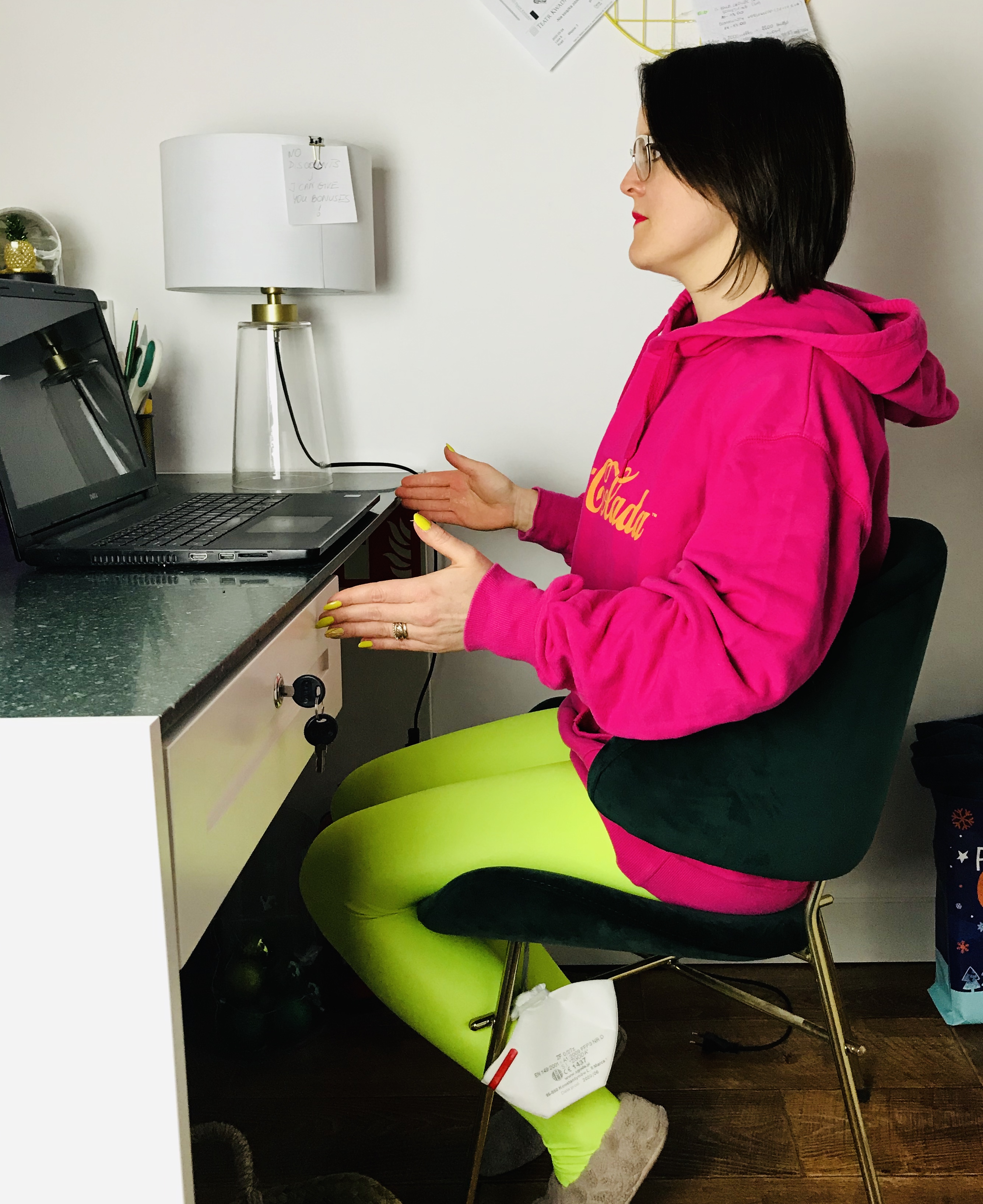 Pozycja: Siedzenie przy biurku bokiem na krześle. Jedna noga ustawiona z przodu zgięta w biodrze i w kolanie. Pośladek siedzi na siedzisku. Druga noga ustawiona z boku siedziska, prosta w biodrze i zgięta w kolanie. Obie nogi ustawione na szerokość bioder. Kostka, kolano i biodro w jednej linii. Miednica neutralna, oba kolce biodrowe w tej samej linii patrzą w przód. Ciało wydłużone, brzuch zaangażowany. Ręka po stronie nogi tylnej ustawiona wzdłuż nogi.