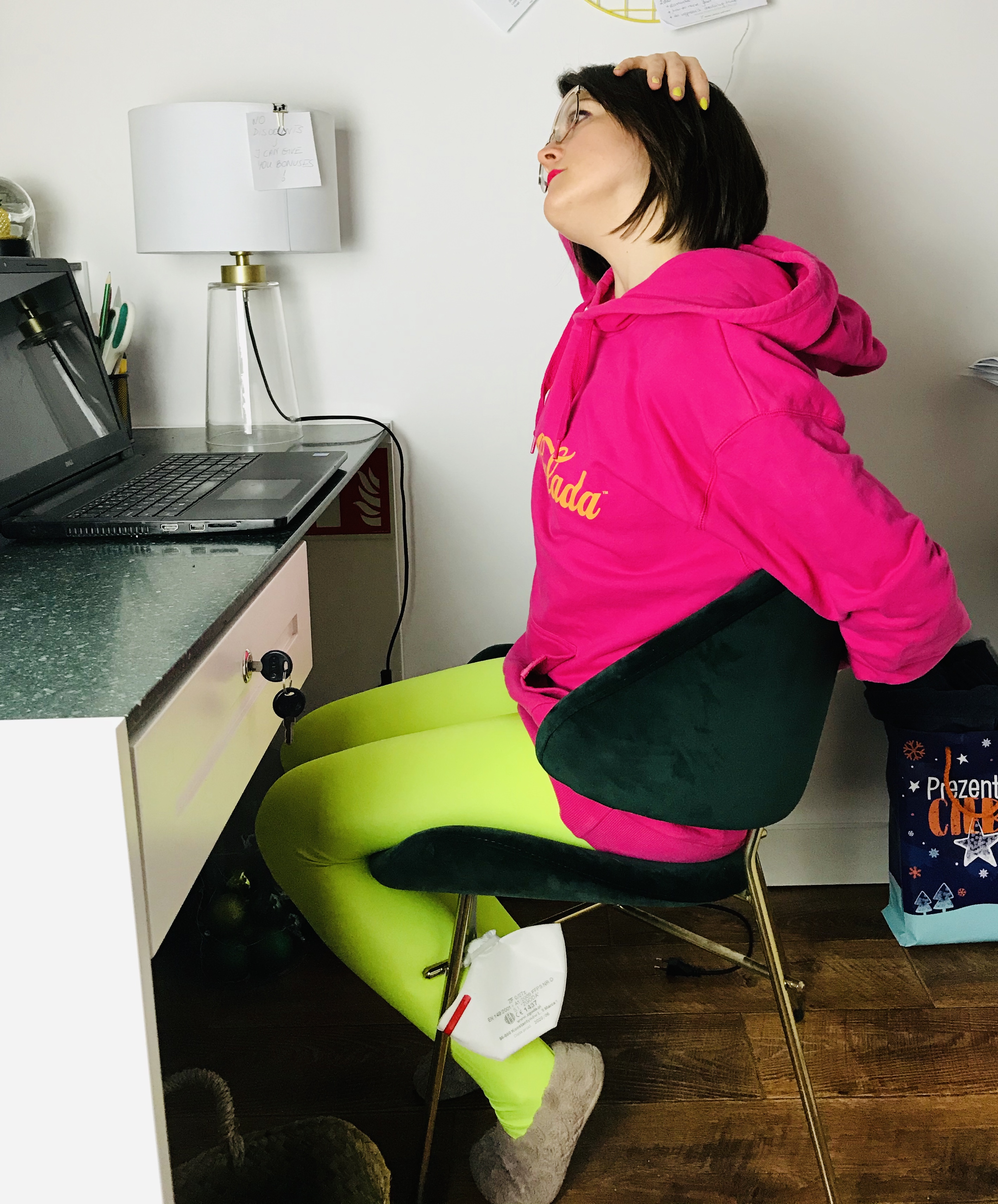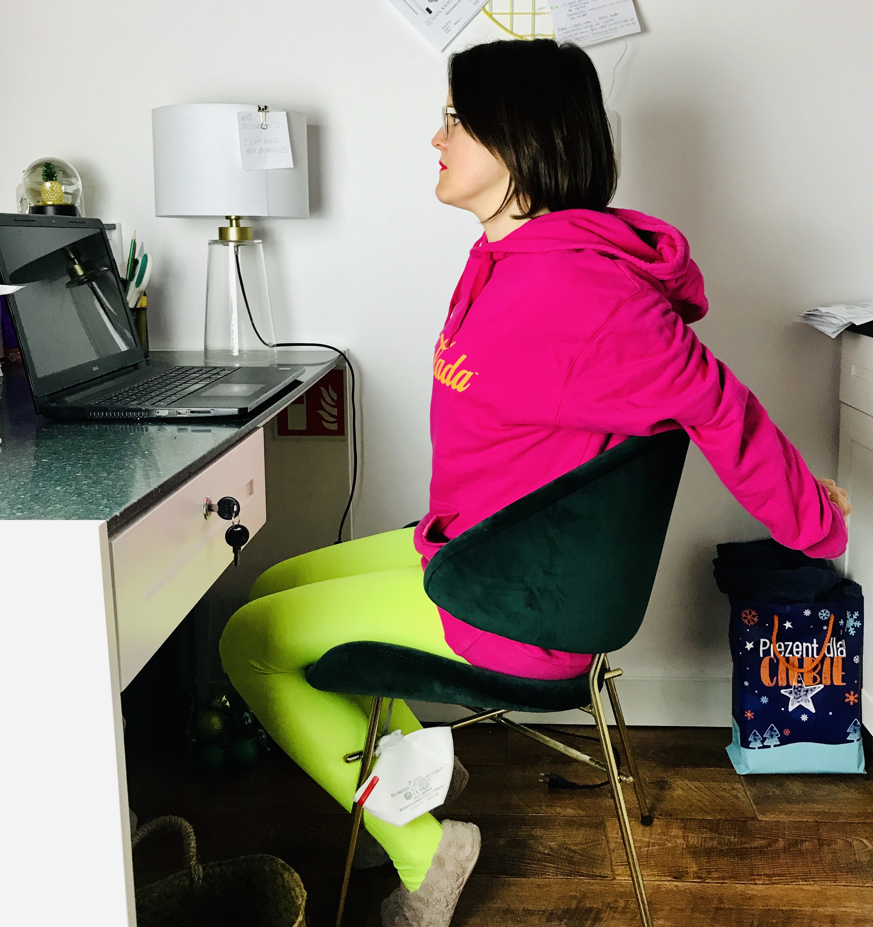 Pozycja: Siedzenie przy biurku (nogi na szerokość bioder, miednica neutralna, guzy kulszowe równomiernie posadzone na siedzisku, neutralne krzywizny kręgosłupa, wydłużone plecy, aktywny brzuch). Jedna dłoń delikatnie łapie za górną część głowy, druga skręcona sięga za plecy (łapie oparcie krzesła).