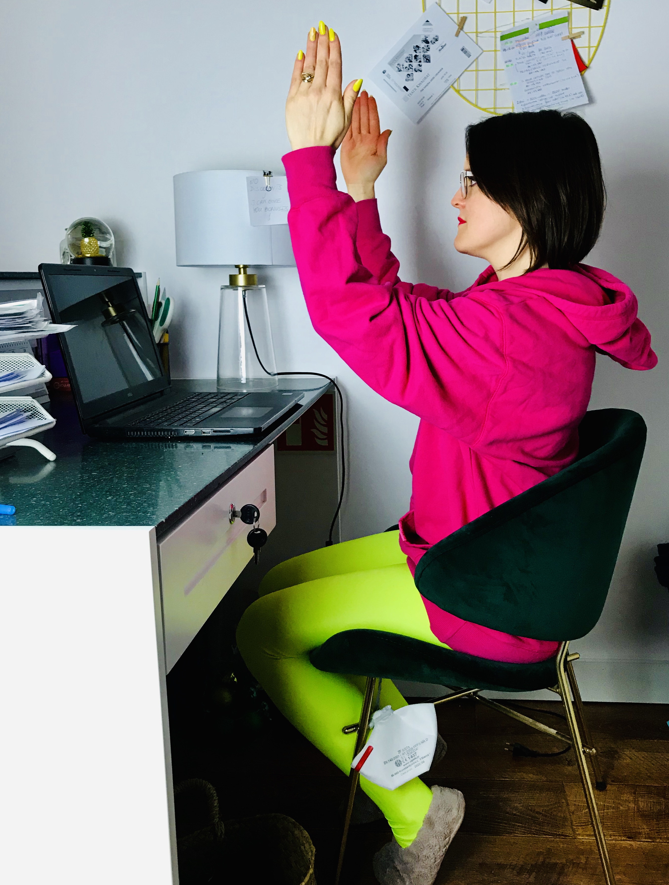 Pozycja: Siedzenie przy biurku (nogi na szerokość bioder, miednica neutralna, guzy kulszowe równomiernie posadzone na siedzisku, neutralne krzywizny kręgosłupa, wydłużone plecy, aktywny brzuch). Wzrok skierowany przed siebie. Obie ręce ugięte w łokciach, blisko klatki. Dłonie na wysokości mostka, żebra zasznurowane, kręgosłup wydłużony.