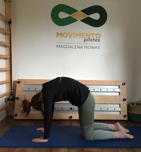 RUCH: Weź wdech na przygotowanie i z wydechem,z napięcia brzucha,wygnij plecy w łuk robiąc tak zwany koci grzbiet. Staraj się by brzuch był aktywny, głowę wyciągaj przeciwnie do pośladków i oddalaj barki od uszu. Z wdechem wróć do prostych pleców.