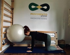 POZYCJA: Klęk podparty, dłonie pod barkami, kolana pod biodrami. Neutralne ustawienie odcinka lędźwiowego i miednicy. Wydłużony kręgosłup. Piłka oparta o ścianę, o piłkę oparta głowa. Brzuch aktywny.