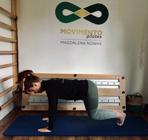POZYCJA: Klęk podparty, dłonie pod barkami, kolana pod biodrami. Neutralne ustawienie odcinka lędźwiowego i miednicy. Wydłużony kręgosłup. Głowa nie wisi. Brzuch aktywny.