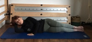 POZYCJA: Leżenie na jednym boku. Nogi złączone, jedna na drugiej. Dolna ręka wyciągnięta na macie, druga zgięta z dłonią opartą na karku. Miednica ustawiona tak by biodro było nad biodrem, a obie strony talii są tej samej długości.
