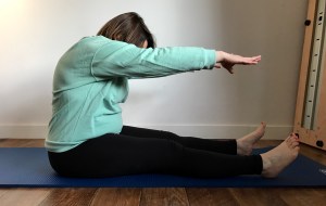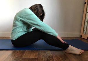 Siad z nogami zgiętymi lub prostymi, szerzej niż szerokość bioder. Ramiona wyciągnięte w przód, na szerokość barków, ciało wydłużone. Guzy kulszowe oparte o matę. Z wdechem wydłużenie kręgosłupa, z wydechem skłon w przód, naciągając kręgosłup. Dłonie można położyć na piłce by mogły być o coś oparte. Ruch jest minimalny, bez dużej ilości wysiłku i napinania mięśni brzucha.