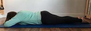 Pozycja: Leżenie na plecach, nogi ustawione na szerokość bioder, zgięte w kolanach. Stopy oparte o drabinkę. Kość krzyżowa i odcinek piersiowy leżą ciężko. Miednica i odcinek lędźwiowy w neutralnej pozycji. Dłonie wewnętrzną stroną skierowane do podłoża, leżą na macie.
