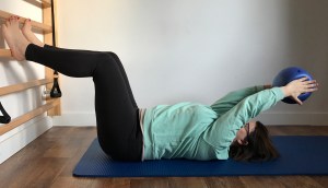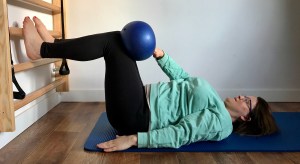 Ruch: Brzuch zasznurowany, miednica leży ciężko. Z wydechem przeniesienie rąk z piłeczką za siebie. Z wdechem powrót do pozycji wyjściowej.