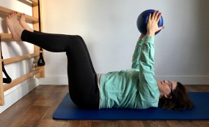 Pozycja: Leżenie na plecach, nogi ustawione na szerokość bioder, zgięte w kolanach. Stopy oparte o drabinkę. Kość krzyżowa i odcinek piersiowy leżą ciężko. Miednica i odcinek lędźwiowy w neutralnej pozycji. Piłeczka umieszczona w dłoniach. Ramiona wyciągnięte w górę.