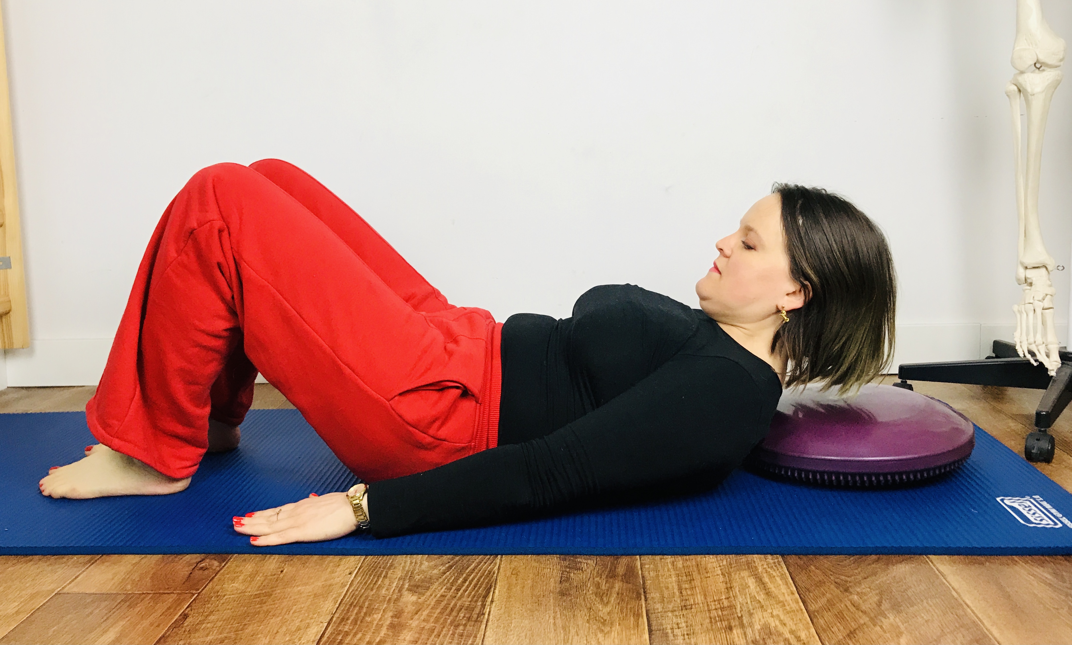 W takiej pozycji, nie z nogami podniesionymi, zacznijmy od nóg odłożonych na podłogę, popracujmy nad głębokim połykaniem śliny, otwieraniu ust, kierowaniu czubka języka do gardła. W każdym z tych ruchów pracują głębokie mięśnie. Warto także popracować nad ruchem gałek ocznych, ponieważ, uwaga, mają one wpływ na napięcie zarówno głębokich mięśni szyi, jak i tułowia!