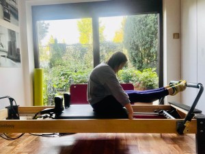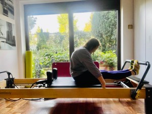 Kathryn Ross-Nash „The red thread of pilates” – tu już mamy pierwszą różnicę, polegającą na ustawieniu ciała. W STOTT mata antypoślizgowa jest umieszczona na środku wózka. W tej książce siadasz w odległości połowy pośladków od brzegu wózka. Dalej, ruch wychodzi z wciśnięcia brzucha do środka by wyprostować nogi.A teraz oddech – wdech na wyprost, ZATRZYMANIE ODDECHU na ruch piętami, wydech kiedy nogi się uginają.